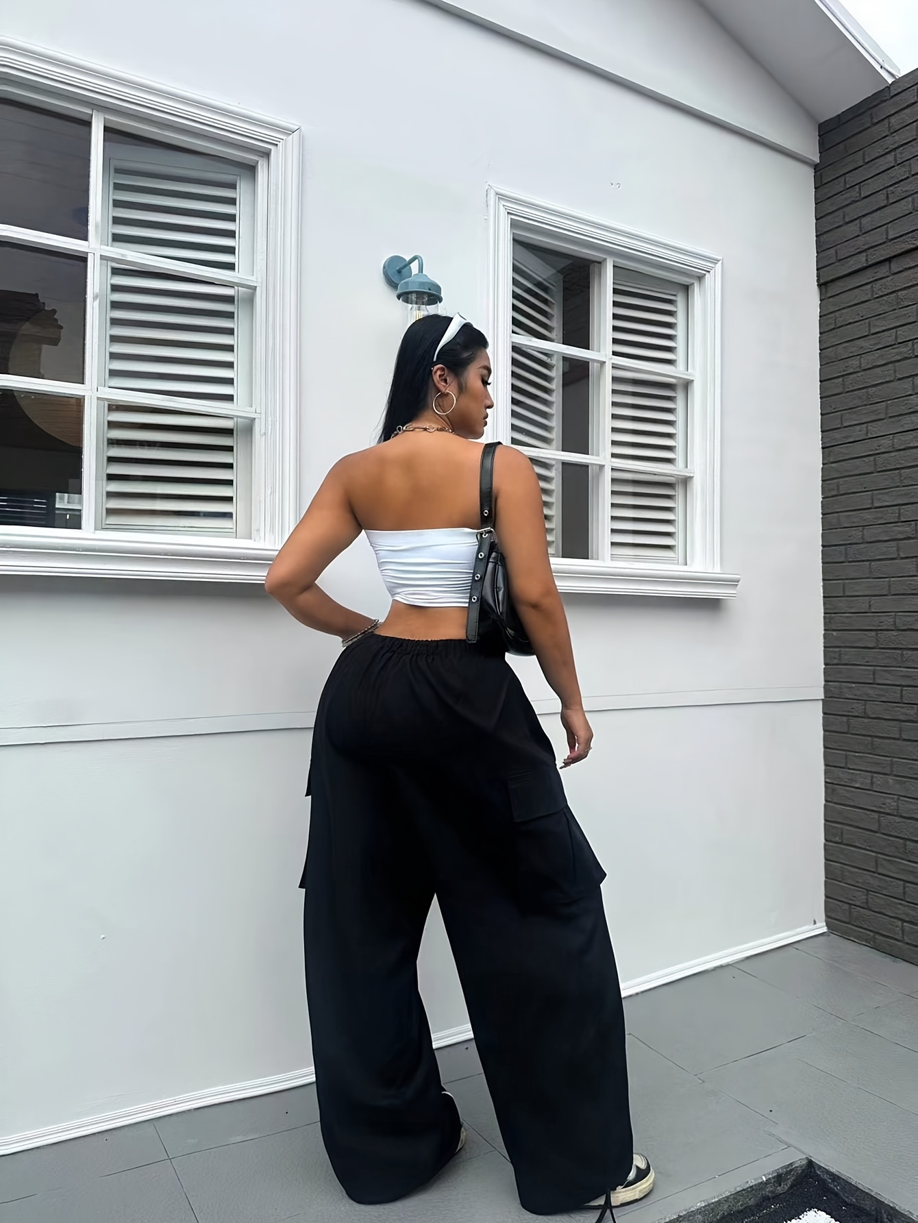 Women’s Casual Cargo Jeans with Pockets – High-Rise, Loose Fit Denim in Solid Color, Non-Stretch Polyester Fabric for Fall/Winter, Bag, Workwear